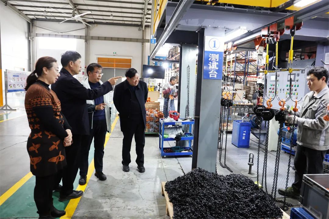 雙鳥集團(tuán)張文忠董事長(zhǎng)、盛嘉慶總經(jīng)理陪同王會(huì)長(zhǎng)一行參觀了雙鳥機(jī)械總裝車間、起重鏈條制造車間。